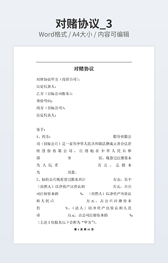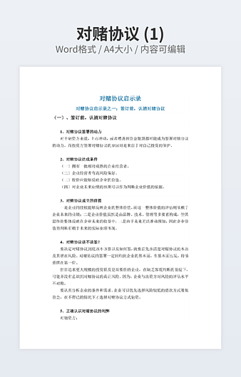 本作品内容为对赌协议书范本模板下载,大小为23.51KB,作品为高清大图模板,格式为docx, 属于对赌协议模板,作品模板源文件下载后可用编辑替换,模板中如有人物画像仅供参考禁止商用。小Q办公网-提供简历,PPT,Word,Excel优质模板素材下载模版平台,拥有海量的工作总结、竞聘求职、年终颁奖、计划书等。 通过小Q办公网下载对赌协议模板源文件编辑修改源文件文字和图片即可使用。