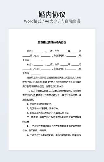 本作品内容为婚前协议书范本下载,大小为17.59KB,作品为高清大图模板,格式为docx, 属于婚前协议模板,作品模板源文件下载后可用编辑替换,模板中如有人物画像仅供参考禁止商用。小Q办公网-提供简历,PPT,Word,Excel优质模板素材下载模版平台,拥有海量的工作总结、竞聘求职、年终颁奖、计划书等。 通过小Q办公网下载婚前协议模板源文件编辑修改源文件文字和图片即可使用。