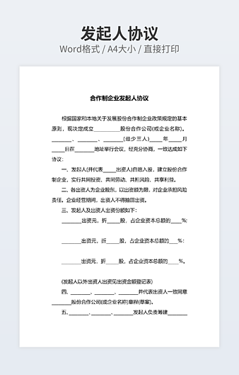 【特殊限制】设计师仅对作品中独创性部分享有著作权,对作品中含有的国旗、国徽等政治图案不享有权利,仅作为作品整体效果的示例展示,禁止商用。 相关关键词: 合作制 企业 发起人 合同