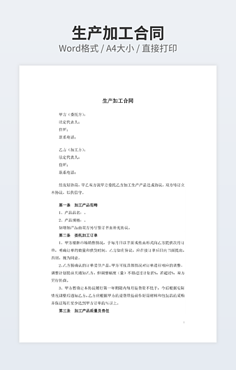 本作品内容为代加工合同格式下载,大小为17.96KB,作品为高清大图模板,格式为docx, 属于加工合同模板,作品模板源文件下载后可用编辑替换,模板中如有人物画像仅供参考禁止商用。小Q办公网-提供简历,PPT,Word,Excel优质模板素材下载模版平台,拥有海量的工作总结、竞聘求职、年终颁奖、计划书等。 通过小Q办公网下载加工合同模板源文件编辑修改源文件文字和图片即可使用。