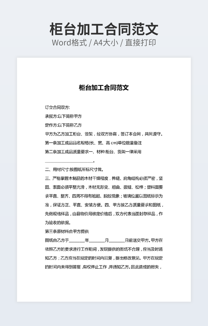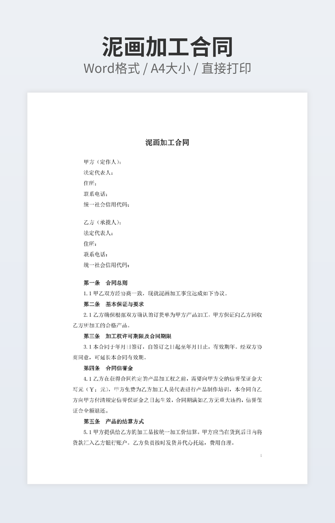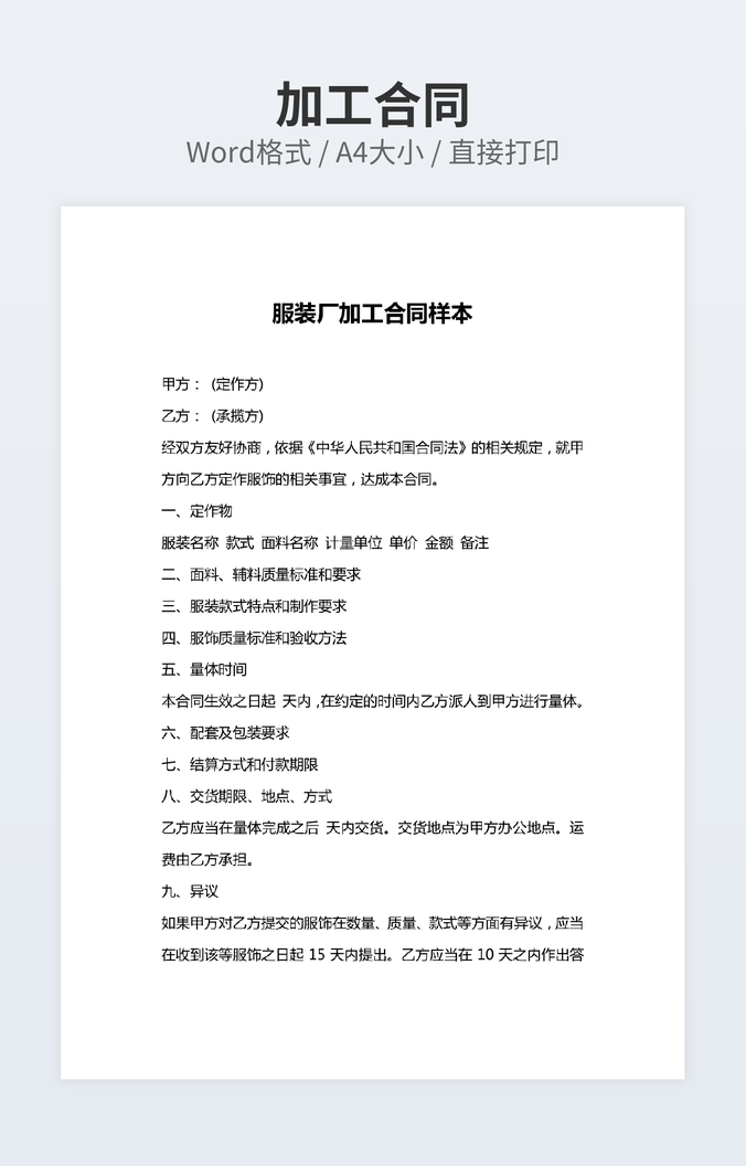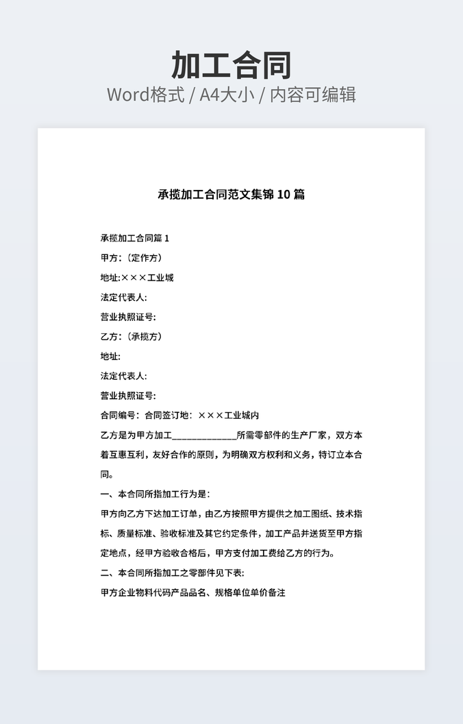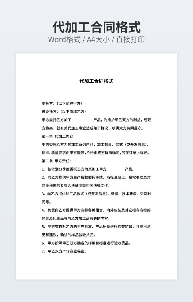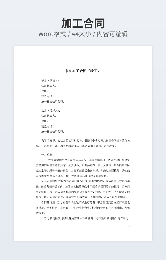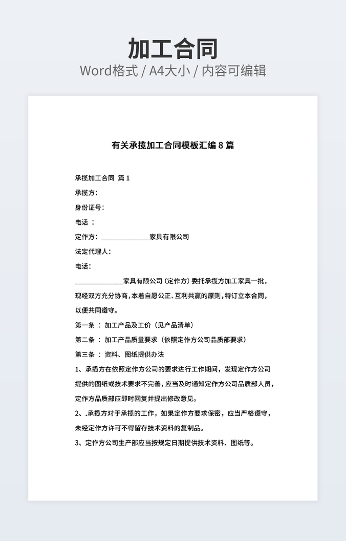 本作品内容为大米代加工合同范本下载,大小为18.89KB,作品为高清大图模板,格式为docx, 属于加工合同模板,作品模板源文件下载后可用编辑替换,模板中如有人物画像仅供参考禁止商用。小Q办公网-提供简历,PPT,Word,Excel优质模板素材下载模版平台,拥有海量的工作总结、竞聘求职、年终颁奖、计划书等。 通过小Q办公网下载加工合同模板源文件编辑修改源文件文字和图片即可使用。