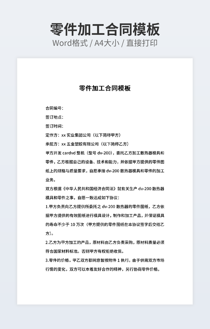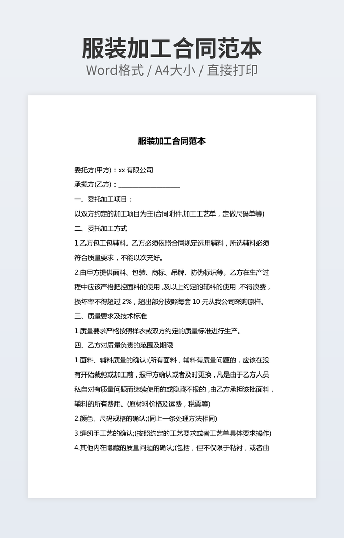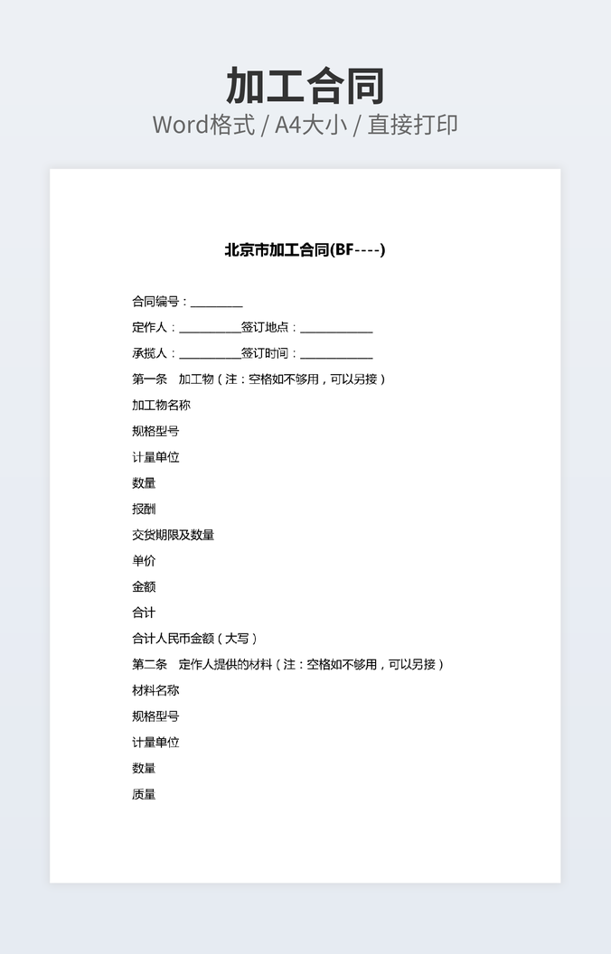 本作品内容为柜台加工合同范文下载,大小为18.47KB,作品为高清大图模板,格式为docx, 属于加工合同模板,作品模板源文件下载后可用编辑替换,模板中如有人物画像仅供参考禁止商用。小Q办公网-提供简历,PPT,Word,Excel优质模板素材下载模版平台,拥有海量的工作总结、竞聘求职、年终颁奖、计划书等。 通过小Q办公网下载加工合同模板源文件编辑修改源文件文字和图片即可使用。