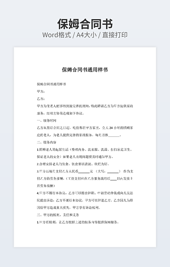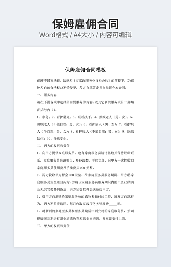本作品内容为雇佣保姆合同范本【三篇】下载,大小为19.17KB,作品为高清大图模板,格式为docx, 属于保姆合同模板,作品模板源文件下载后可用编辑替换,模板中如有人物画像仅供参考禁止商用。小Q办公网-提供简历,PPT,Word,Excel优质模板素材下载模版平台,拥有海量的工作总结、竞聘求职、年终颁奖、计划书等。 通过小Q办公网下载保姆合同模板源文件编辑修改源文件文字和图片即可使用。