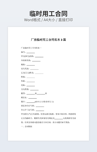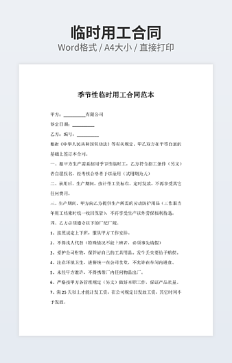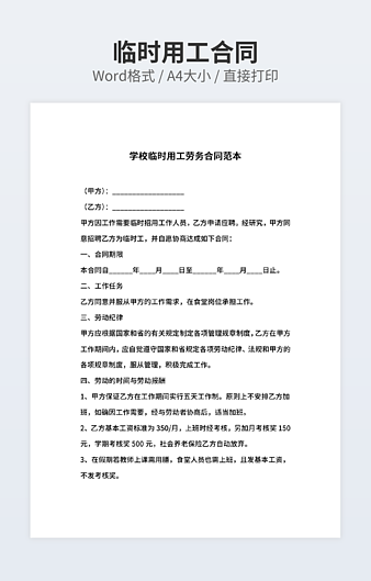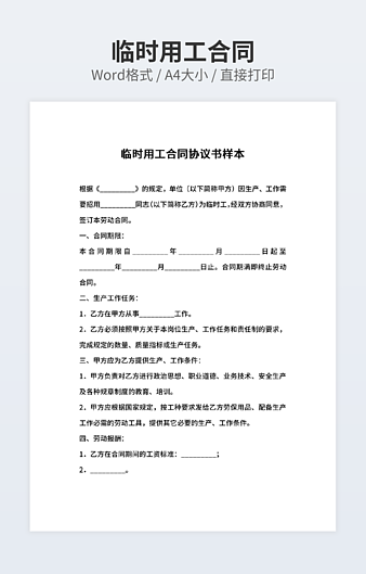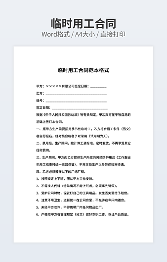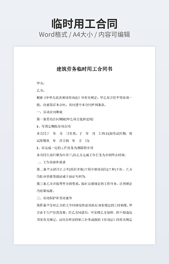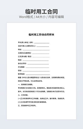 【特殊限制】设计师仅对作品中独创性部分享有著作权,对作品中含有的国旗、国徽等政治图案不享有权利,仅作为作品整体效果的示例展示,禁止商用。 相关关键词: 精选 临时 用工 合同范本