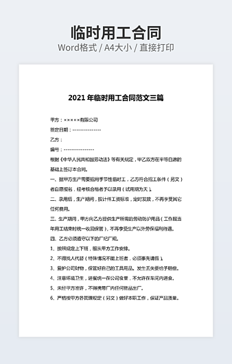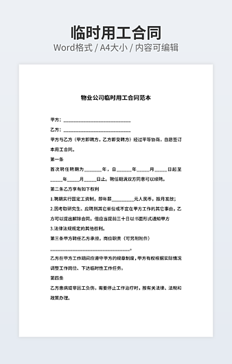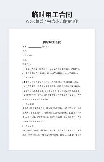 本作品内容为精选临时用工合同范本下载,大小为17.71KB,作品为高清大图模板,格式为docx, 属于临时用工合同模板,作品模板源文件下载后可用编辑替换,模板中如有人物画像仅供参考禁止商用。小Q办公网-提供简历,PPT,Word,Excel优质模板素材下载模版平台,拥有海量的工作总结、竞聘求职、年终颁奖、计划书等。 通过小Q办公网下载临时用工合同模板源文件编辑修改源文件文字和图片即可使用。