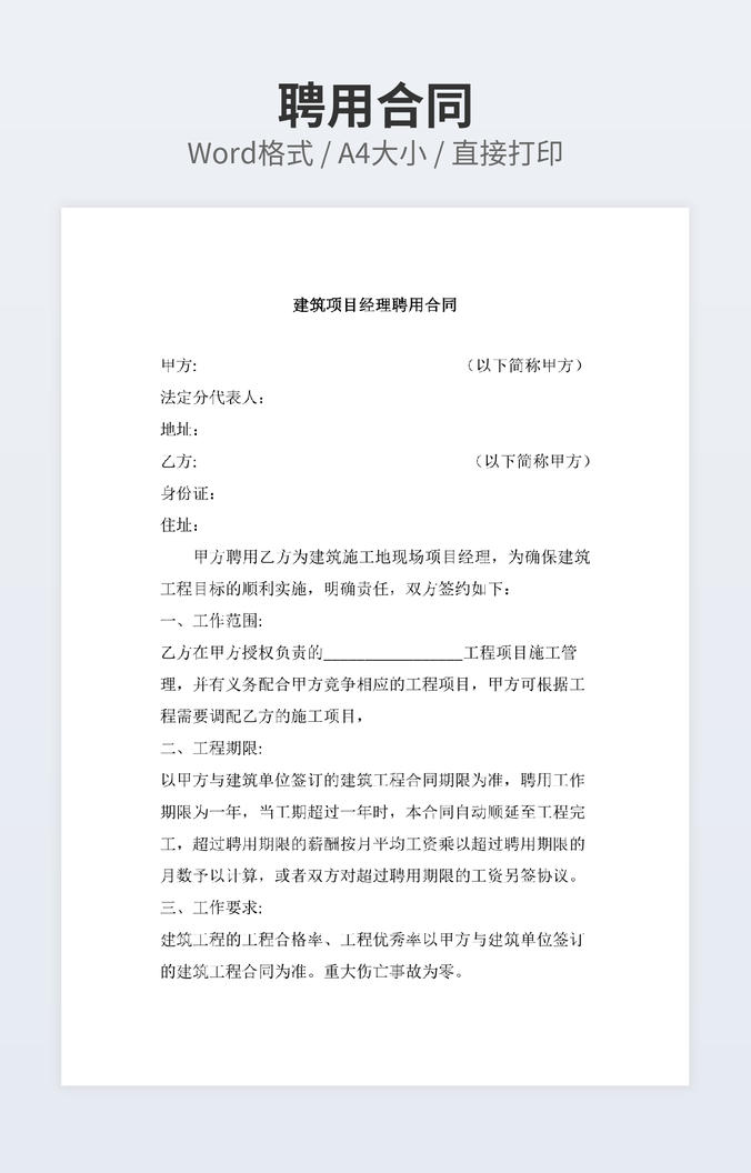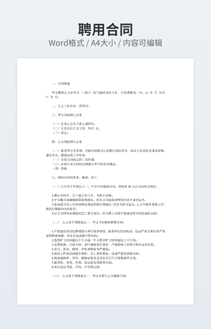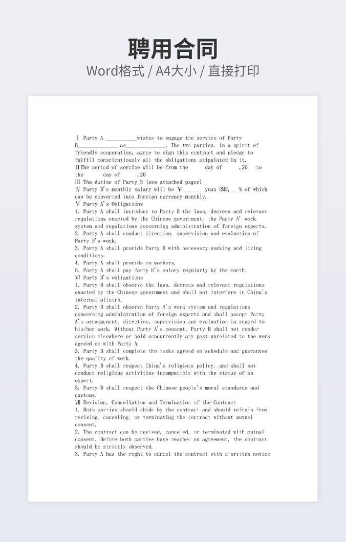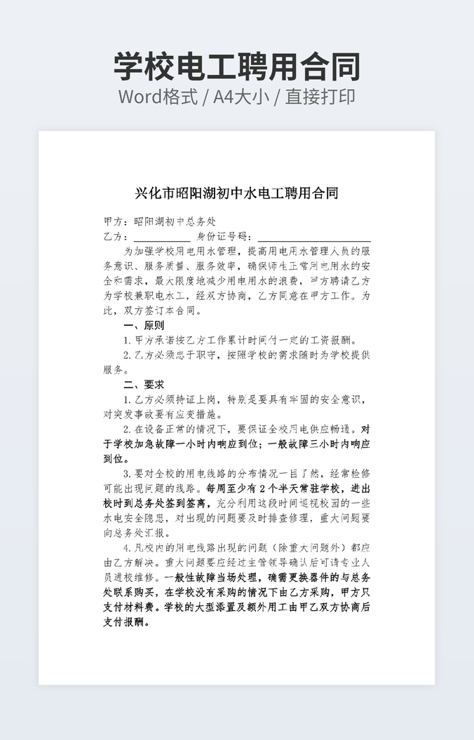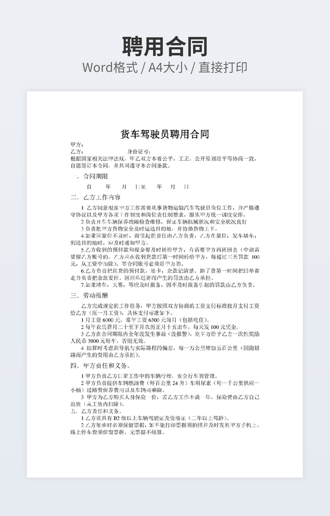 本作品内容为塔吊司机聘用合同下载,大小为25.5KB,作品为高清大图模板,格式为doc, 属于聘用合同模板,作品模板源文件下载后可用编辑替换,模板中如有人物画像仅供参考禁止商用。小Q办公网-提供简历,PPT,Word,Excel优质模板素材下载模版平台,拥有海量的工作总结、竞聘求职、年终颁奖、计划书等。 通过小Q办公网下载聘用合同模板源文件编辑修改源文件文字和图片即可使用。