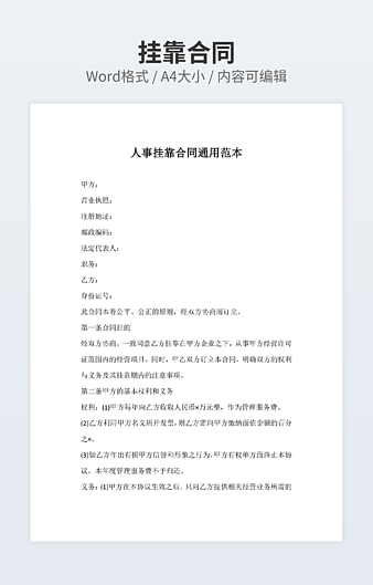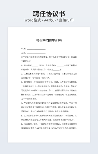 本作品内容为聘任协议书(挂靠合同)下载,大小为12.28KB,作品为高清大图模板,格式为docx, 属于挂靠合同模板,作品模板源文件下载后可用编辑替换,模板中如有人物画像仅供参考禁止商用。小Q办公网-提供简历,PPT,Word,Excel优质模板素材下载模版平台,拥有海量的工作总结、竞聘求职、年终颁奖、计划书等。 通过小Q办公网下载挂靠合同模板源文件编辑修改源文件文字和图片即可使用。