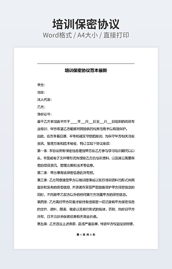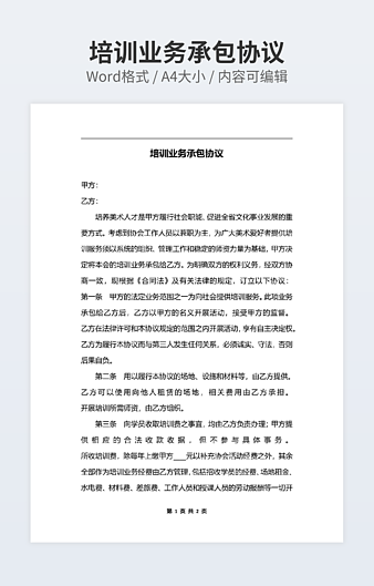 本作品内容为职业技能培训管理协议下载,大小为16.95KB,作品为高清大图模板,格式为docx, 属于培训协议模板,作品模板源文件下载后可用编辑替换,模板中如有人物画像仅供参考禁止商用。小Q办公网-提供简历,PPT,Word,Excel优质模板素材下载模版平台,拥有海量的工作总结、竞聘求职、年终颁奖、计划书等。 通过小Q办公网下载培训协议模板源文件编辑修改源文件文字和图片即可使用。