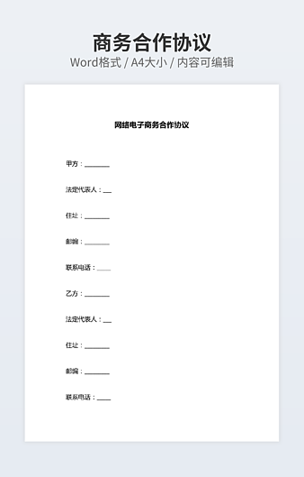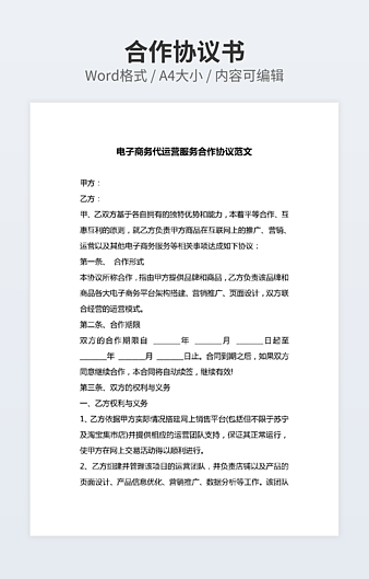 本作品内容为电子商务平台招商合作协议范本最新整理版下载,大小为15.54KB,作品为高清大图模板,格式为docx, 属于商务合作模板,作品模板源文件下载后可用编辑替换,模板中如有人物画像仅供参考禁止商用。小Q办公网-提供简历,PPT,Word,Excel优质模板素材下载模版平台,拥有海量的工作总结、竞聘求职、年终颁奖、计划书等。 通过小Q办公网下载商务合作模板源文件编辑修改源文件文字和图片即可使用。