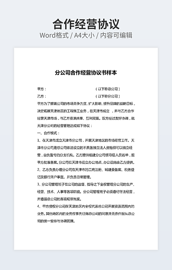 本作品内容为品牌合作经营合作协议范本最新整理版下载,大小为14.85KB,作品为高清大图模板,格式为docx, 属于经营合作模板,作品模板源文件下载后可用编辑替换,模板中如有人物画像仅供参考禁止商用。小Q办公网-提供简历,PPT,Word,Excel优质模板素材下载模版平台,拥有海量的工作总结、竞聘求职、年终颁奖、计划书等。 通过小Q办公网下载经营合作模板源文件编辑修改源文件文字和图片即可使用。