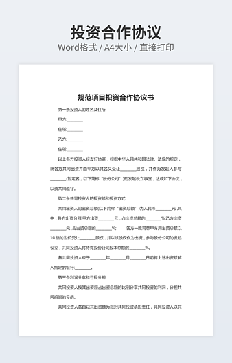 本作品内容为风投合作协议范本新下载,大小为41.84KB,作品为高清大图模板,格式为doc, 属于投资协议模板,作品模板源文件下载后可用编辑替换,模板中如有人物画像仅供参考禁止商用。小Q办公网-提供简历,PPT,Word,Excel优质模板素材下载模版平台,拥有海量的工作总结、竞聘求职、年终颁奖、计划书等。 通过小Q办公网下载投资协议模板源文件编辑修改源文件文字和图片即可使用。