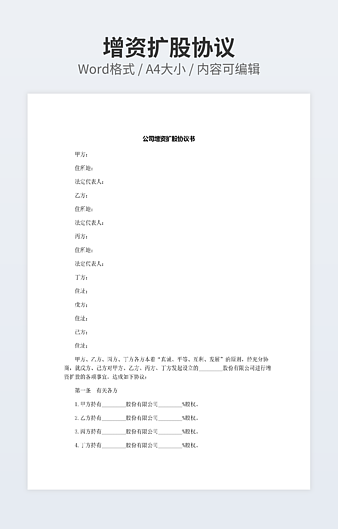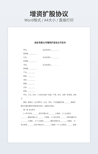 【特殊限制】设计师仅对作品中独创性部分享有著作权,对作品中含有的国旗、国徽等政治图案不享有权利,仅作为作品整体效果的示例展示,禁止商用。 相关关键词: 有限责任 公司 增资 扩股 协议