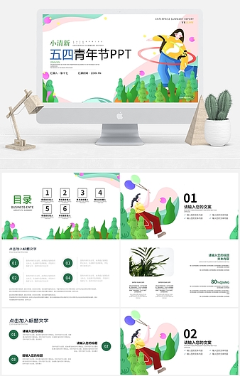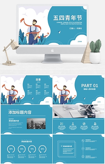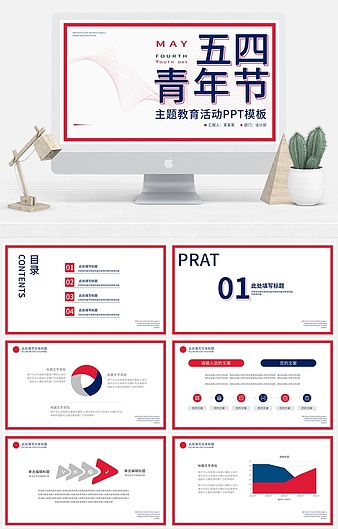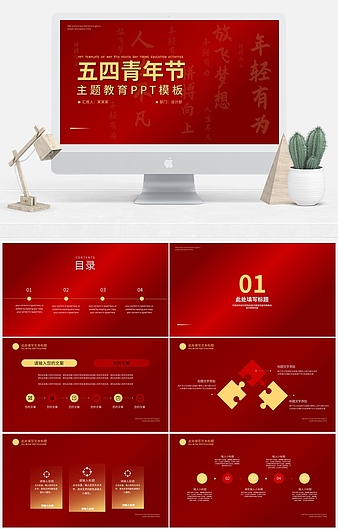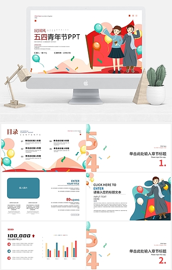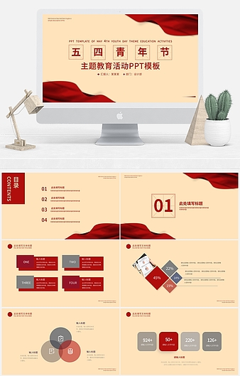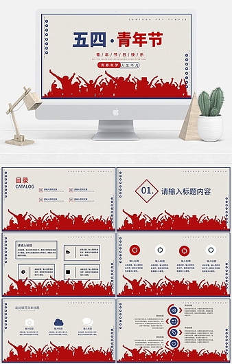 红色插画风五四青年节PPT模板