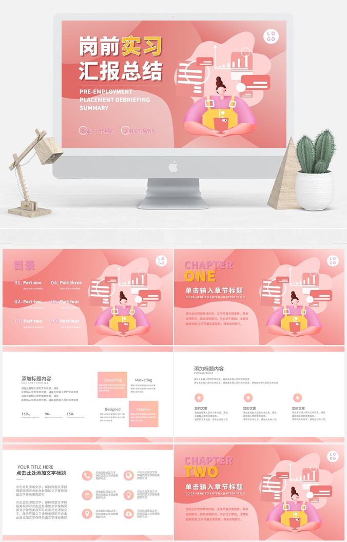【特殊限制】设计师仅对作品中独创性部分享有著作权,对作品中含有的国旗、国徽等政治图案不享有权利,仅作为作品整体效果的示例展示,禁止商用。 相关关键词: 粉色 清新 插画风 实习 汇报 学生 校园 工作 职场