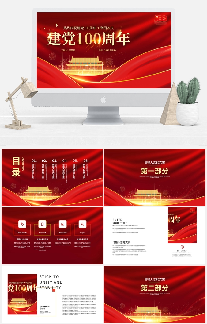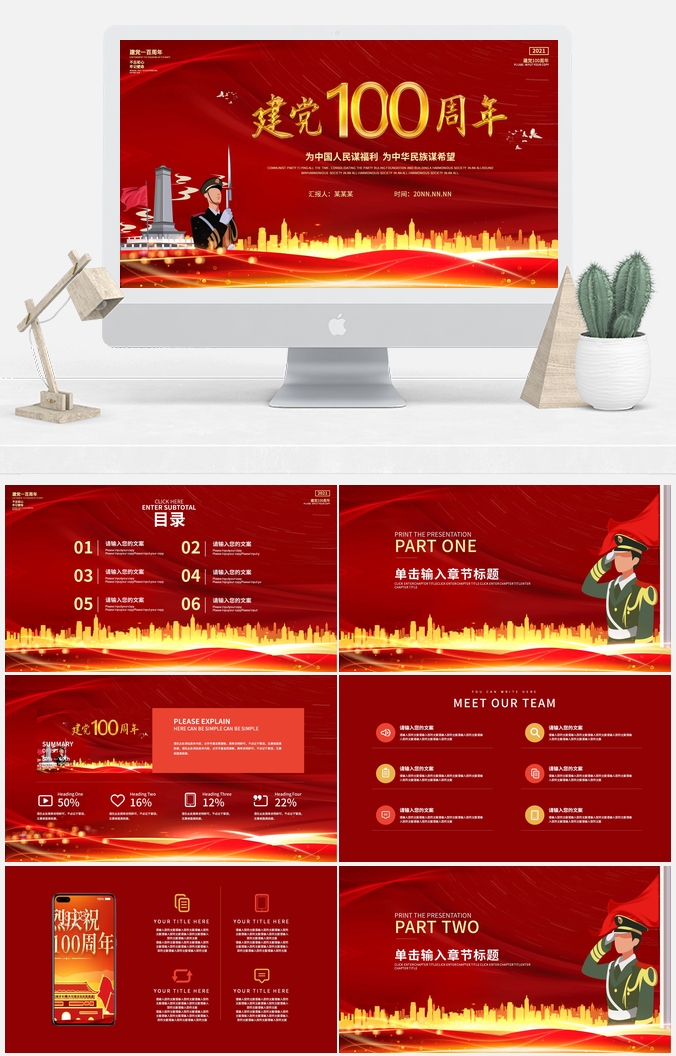 红色奢华风百年奋斗踏新征程建党一百周年PPT模板