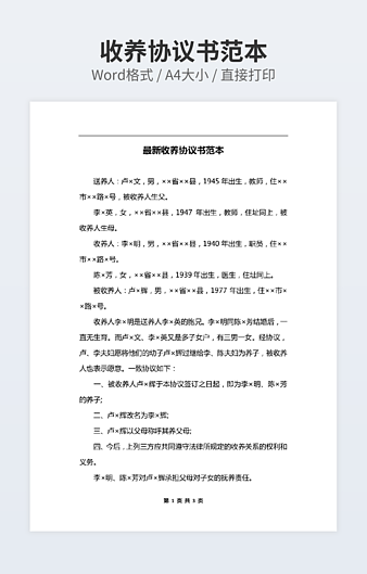 本作品内容为抚养协议书范文4篇下载,大小为18.56KB,作品为高清大图模板,格式为docx, 属于收养协议模板,作品模板源文件下载后可用编辑替换,模板中如有人物画像仅供参考禁止商用。小Q办公网-提供简历,PPT,Word,Excel优质模板素材下载模版平台,拥有海量的工作总结、竞聘求职、年终颁奖、计划书等。 通过小Q办公网下载收养协议模板源文件编辑修改源文件文字和图片即可使用。