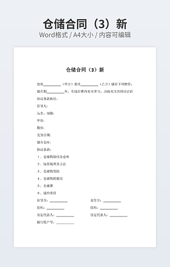 本作品内容为仓储合同 (6)下载,大小为34.5KB,作品为高清大图模板,格式为doc, 属于仓储合同模板,作品模板源文件下载后可用编辑替换,模板中如有人物画像仅供参考禁止商用。小Q办公网-提供简历,PPT,Word,Excel优质模板素材下载模版平台,拥有海量的工作总结、竞聘求职、年终颁奖、计划书等。 通过小Q办公网下载仓储合同模板源文件编辑修改源文件文字和图片即可使用。