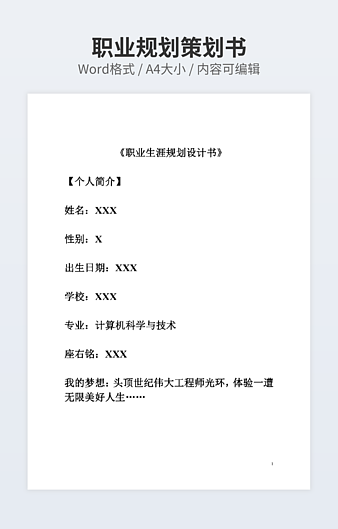 本作品内容为大学生人生职业规划书下载,大小为25.5KB,作品为高清大图模板,格式为doc, 属于职业规划模板,作品模板源文件下载后可用编辑替换,模板中如有人物画像仅供参考禁止商用。小Q办公网-提供简历,PPT,Word,Excel优质模板素材下载模版平台,拥有海量的工作总结、竞聘求职、年终颁奖、计划书等。 通过小Q办公网下载职业规划模板源文件编辑修改源文件文字和图片即可使用。