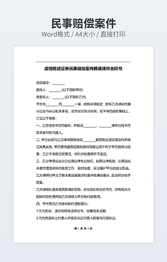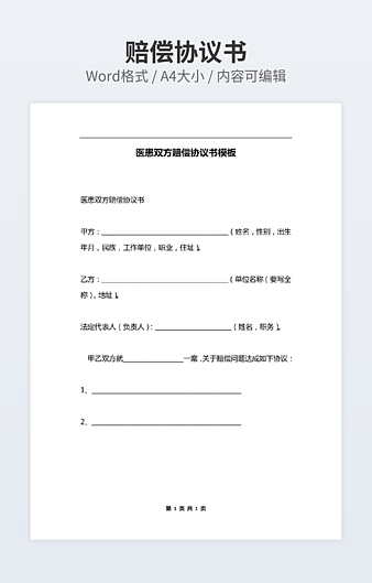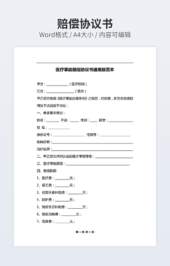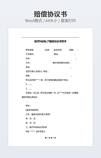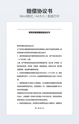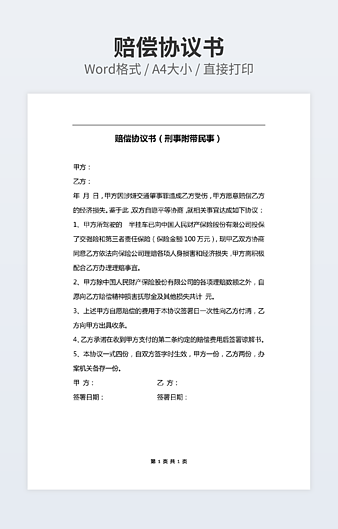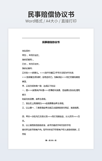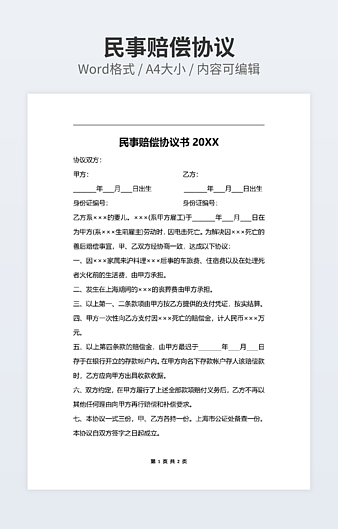 【特殊限制】设计师仅对作品中独创性部分享有著作权,对作品中含有的国旗、国徽等政治图案不享有权利,仅作为作品整体效果的示例展示,禁止商用。 相关关键词: 20XX 民事 赔偿 协议书 范本
