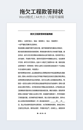 【特殊限制】设计师仅对作品中独创性部分享有著作权,对作品中含有的国旗、国徽等政治图案不享有权利,仅作为作品整体效果的示例展示,禁止商用。 相关关键词: 工程款 纠纷 答辩状