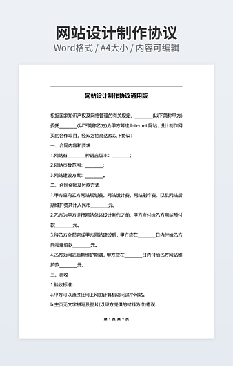 本作品内容为网站设计制作协议书下载,大小为18.26KB,作品为高清大图模板,格式为docx, 属于设计合同模板,作品模板源文件下载后可用编辑替换,模板中如有人物画像仅供参考禁止商用。小Q办公网-提供简历,PPT,Word,Excel优质模板素材下载模版平台,拥有海量的工作总结、竞聘求职、年终颁奖、计划书等。 通过小Q办公网下载设计合同模板源文件编辑修改源文件文字和图片即可使用。