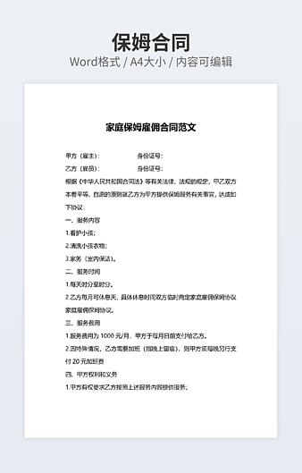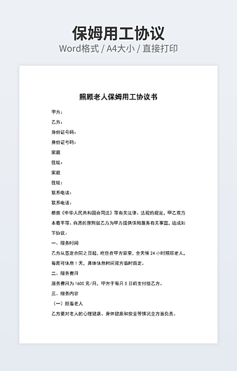 本作品内容为20XX年保姆用工合同范本下载,大小为21.27KB,作品为高清大图模板,格式为docx, 属于保姆合同模板,作品模板源文件下载后可用编辑替换,模板中如有人物画像仅供参考禁止商用。小Q办公网-提供简历,PPT,Word,Excel优质模板素材下载模版平台,拥有海量的工作总结、竞聘求职、年终颁奖、计划书等。 通过小Q办公网下载保姆合同模板源文件编辑修改源文件文字和图片即可使用。