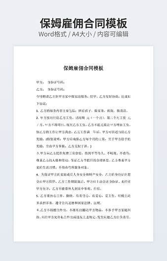【特殊限制】设计师仅对作品中独创性部分享有著作权,对作品中含有的国旗、国徽等政治图案不享有权利,仅作为作品整体效果的示例展示,禁止商用。 相关关键词: 新保姆 保姆 合同范本 3篇 专业版