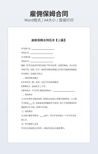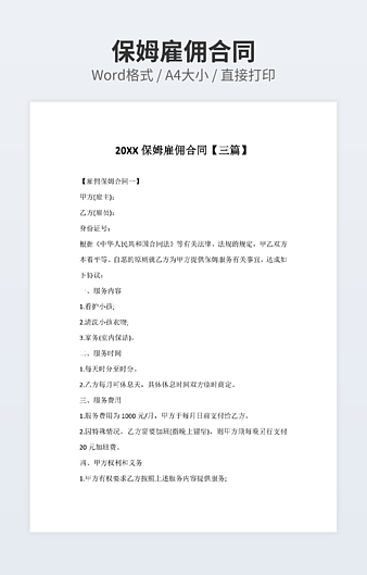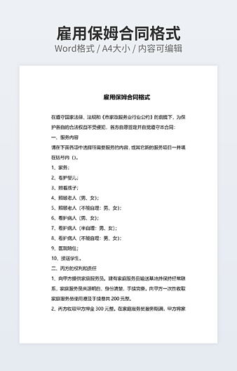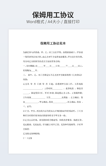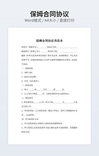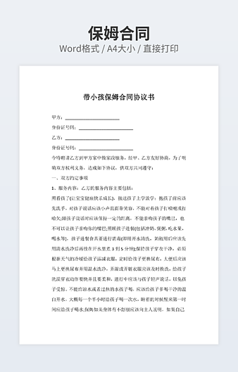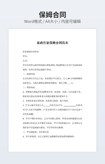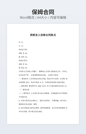 本作品内容为照顾老人保姆合同简单范本下载,大小为15.72KB,作品为高清大图模板,格式为docx, 属于保姆合同模板,作品模板源文件下载后可用编辑替换,模板中如有人物画像仅供参考禁止商用。小Q办公网-提供简历,PPT,Word,Excel优质模板素材下载模版平台,拥有海量的工作总结、竞聘求职、年终颁奖、计划书等。 通过小Q办公网下载保姆合同模板源文件编辑修改源文件文字和图片即可使用。