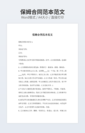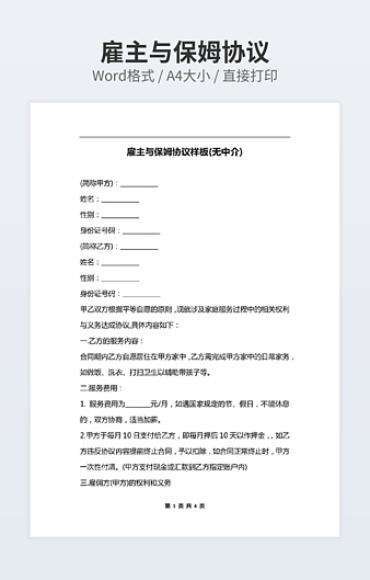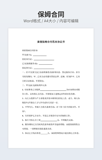 本作品内容为老人雇保姆协议书下载,大小为18.17KB,作品为高清大图模板,格式为docx, 属于保姆合同模板,作品模板源文件下载后可用编辑替换,模板中如有人物画像仅供参考禁止商用。小Q办公网-提供简历,PPT,Word,Excel优质模板素材下载模版平台,拥有海量的工作总结、竞聘求职、年终颁奖、计划书等。 通过小Q办公网下载保姆合同模板源文件编辑修改源文件文字和图片即可使用。
