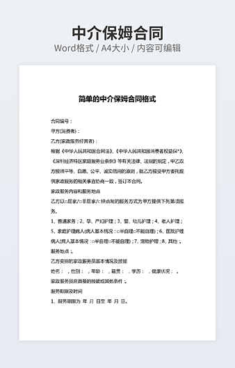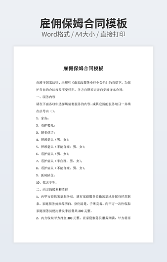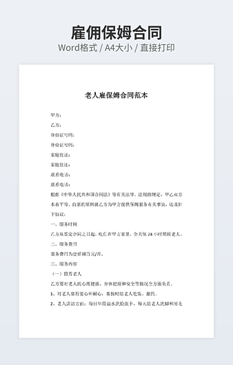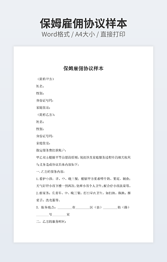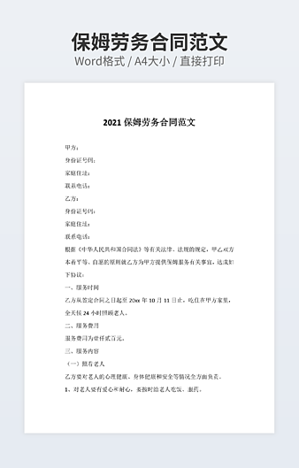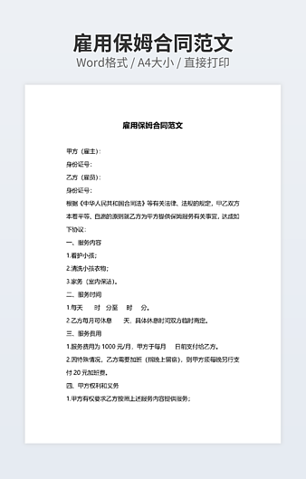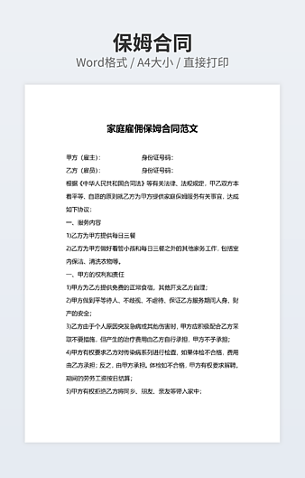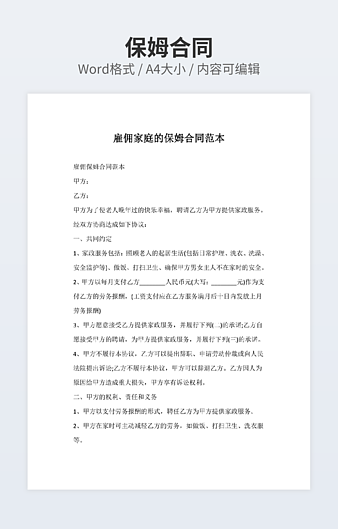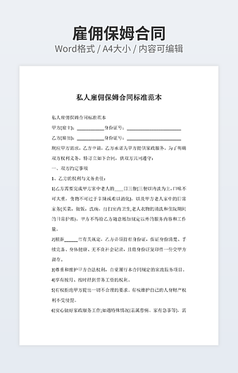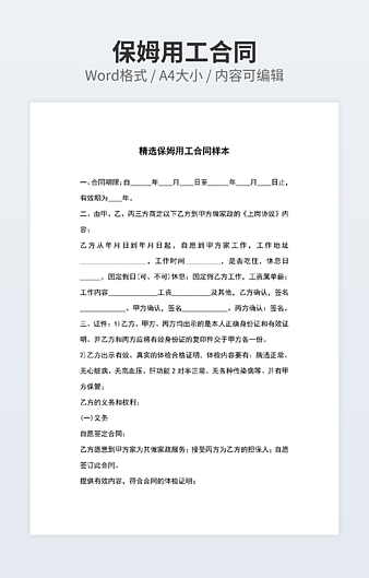 【特殊限制】设计师仅对作品中独创性部分享有著作权,对作品中含有的国旗、国徽等政治图案不享有权利,仅作为作品整体效果的示例展示,禁止商用。 相关关键词: 聘用 保姆 合同范本