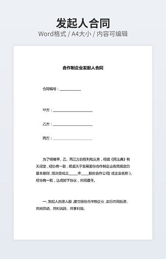 本作品内容为公司发起人协议书下载,大小为16.92KB,作品为高清大图模板,格式为docx, 属于发起人协议模板,作品模板源文件下载后可用编辑替换,模板中如有人物画像仅供参考禁止商用。小Q办公网-提供简历,PPT,Word,Excel优质模板素材下载模版平台,拥有海量的工作总结、竞聘求职、年终颁奖、计划书等。 通过小Q办公网下载发起人协议模板源文件编辑修改源文件文字和图片即可使用。