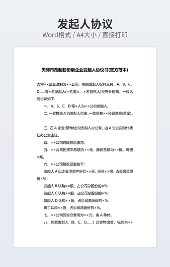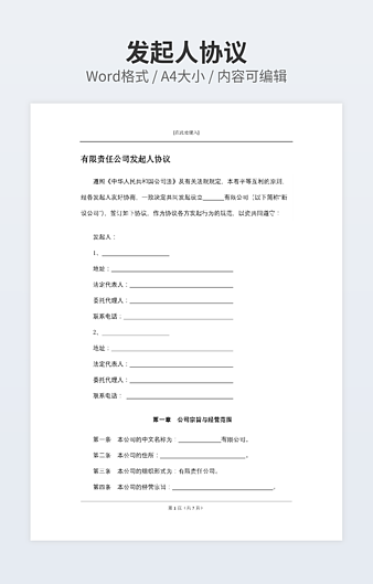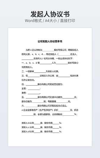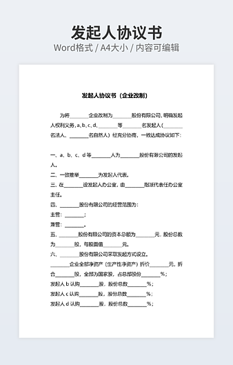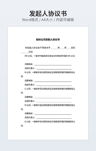 【特殊限制】设计师仅对作品中独创性部分享有著作权,对作品中含有的国旗、国徽等政治图案不享有权利,仅作为作品整体效果的示例展示,禁止商用。 相关关键词: 公司 发起人 协议书
