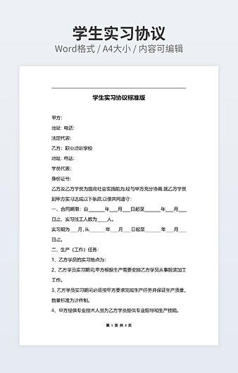 【特殊限制】设计师仅对作品中独创性部分享有著作权,对作品中含有的国旗、国徽等政治图案不享有权利,仅作为作品整体效果的示例展示,禁止商用。 相关关键词: 实习 协议书 标准 范本