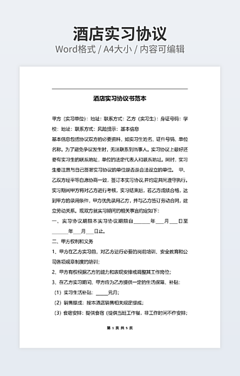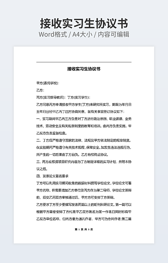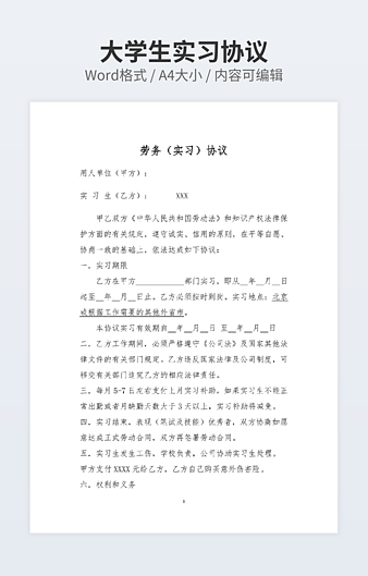 本作品内容为应届毕业生实习合同范本下载,大小为19.05KB,作品为高清大图模板,格式为docx, 属于实习协议模板,作品模板源文件下载后可用编辑替换,模板中如有人物画像仅供参考禁止商用。小Q办公网-提供简历,PPT,Word,Excel优质模板素材下载模版平台,拥有海量的工作总结、竞聘求职、年终颁奖、计划书等。 通过小Q办公网下载实习协议模板源文件编辑修改源文件文字和图片即可使用。