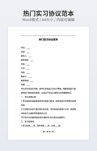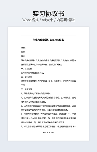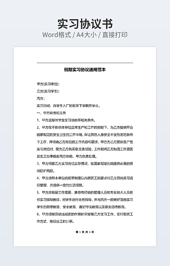 【特殊限制】设计师仅对作品中独创性部分享有著作权,对作品中含有的国旗、国徽等政治图案不享有权利,仅作为作品整体效果的示例展示,禁止商用。 相关关键词: 通用 应届毕业生 实习 协议书 范本