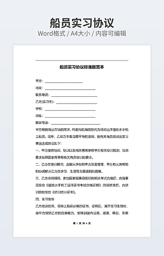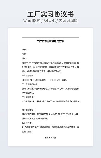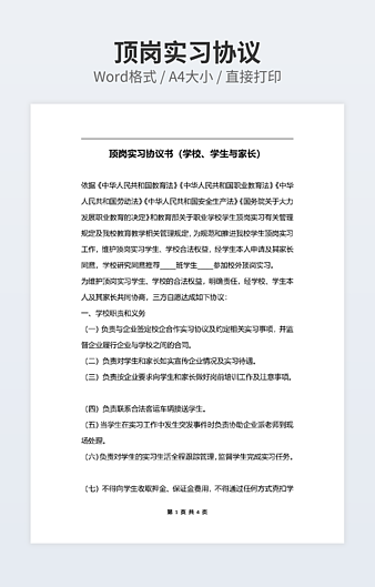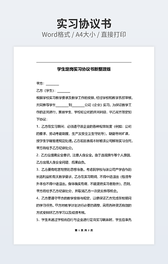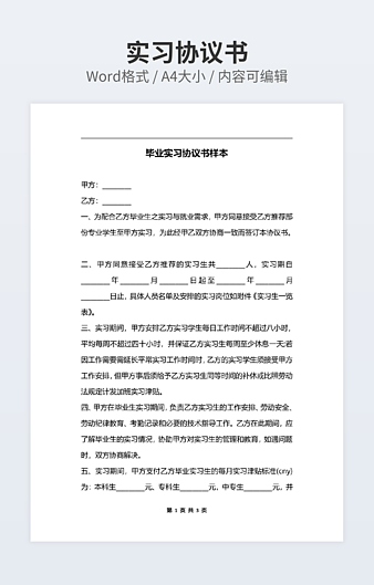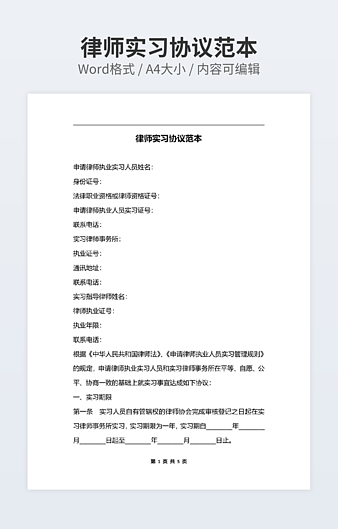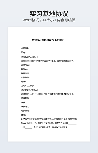 【特殊限制】设计师仅对作品中独创性部分享有著作权,对作品中含有的国旗、国徽等政治图案不享有权利,仅作为作品整体效果的示例展示,禁止商用。 相关关键词: 酒店 实习 协议书 模板