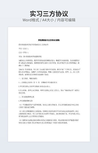 【特殊限制】设计师仅对作品中独创性部分享有著作权,对作品中含有的国旗、国徽等政治图案不享有权利,仅作为作品整体效果的示例展示,禁止商用。 相关关键词: 顶岗 实习 协议书 范文