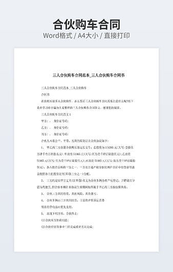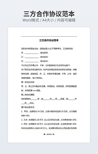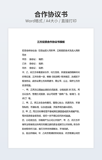 【特殊限制】设计师仅对作品中独创性部分享有著作权,对作品中含有的国旗、国徽等政治图案不享有权利,仅作为作品整体效果的示例展示,禁止商用。 相关关键词: 三人 合伙人 合作 协议书