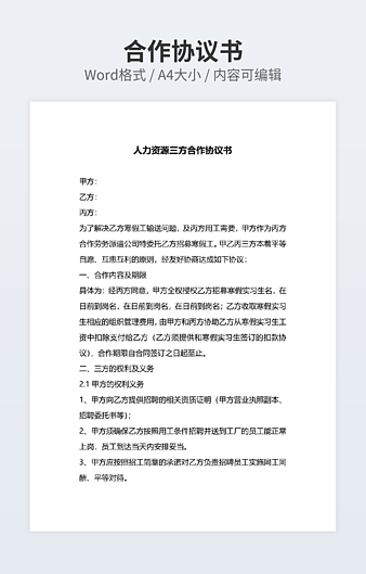 本作品内容为三人合伙人合作协议书下载,大小为28KB,作品为高清大图模板,格式为doc, 属于多人合作模板,作品模板源文件下载后可用编辑替换,模板中如有人物画像仅供参考禁止商用。小Q办公网-提供简历,PPT,Word,Excel优质模板素材下载模版平台,拥有海量的工作总结、竞聘求职、年终颁奖、计划书等。 通过小Q办公网下载多人合作模板源文件编辑修改源文件文字和图片即可使用。