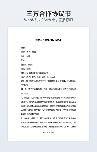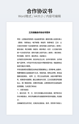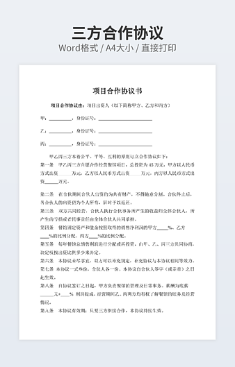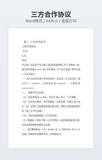 本作品内容为三人酒店合伙合同下载,大小为31.5KB,作品为高清大图模板,格式为doc, 属于多人合作模板,作品模板源文件下载后可用编辑替换,模板中如有人物画像仅供参考禁止商用。小Q办公网-提供简历,PPT,Word,Excel优质模板素材下载模版平台,拥有海量的工作总结、竞聘求职、年终颁奖、计划书等。 通过小Q办公网下载多人合作模板源文件编辑修改源文件文字和图片即可使用。