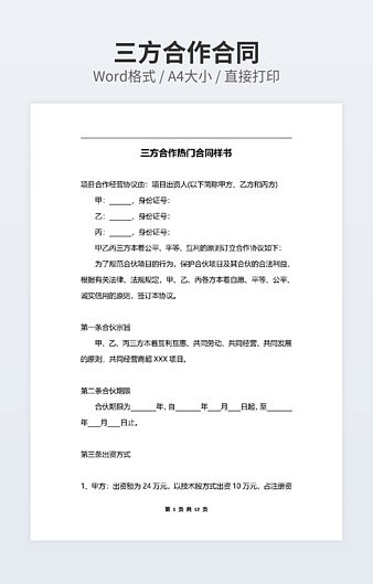 【特殊限制】设计师仅对作品中独创性部分享有著作权,对作品中含有的国旗、国徽等政治图案不享有权利,仅作为作品整体效果的示例展示,禁止商用。 相关关键词: 三方 合作 协议书