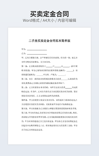 本作品内容为定金合同范本精选下载,大小为14.6KB,作品为高清大图模板,格式为docx, 属于定金合同模板,作品模板源文件下载后可用编辑替换,模板中如有人物画像仅供参考禁止商用。小Q办公网-提供简历,PPT,Word,Excel优质模板素材下载模版平台,拥有海量的工作总结、竞聘求职、年终颁奖、计划书等。 通过小Q办公网下载定金合同模板源文件编辑修改源文件文字和图片即可使用。