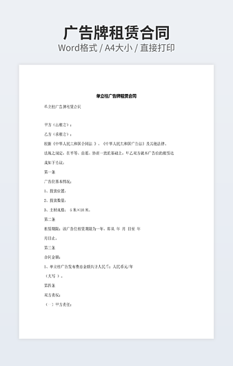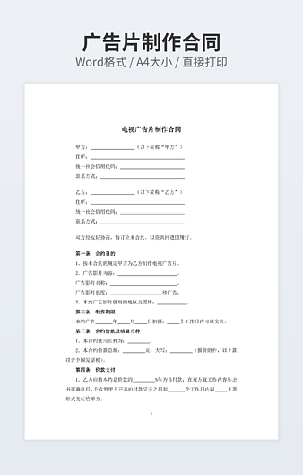 本作品内容为广告外包合同下载,大小为36.5KB,作品为高清大图模板,格式为doc, 属于广告合同模板,作品模板源文件下载后可用编辑替换,模板中如有人物画像仅供参考禁止商用。小Q办公网-提供简历,PPT,Word,Excel优质模板素材下载模版平台,拥有海量的工作总结、竞聘求职、年终颁奖、计划书等。 通过小Q办公网下载广告合同模板源文件编辑修改源文件文字和图片即可使用。