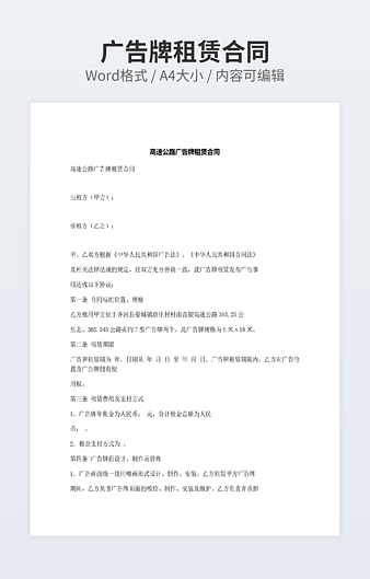 本作品内容为浙江省杂志广告发布合同下载,大小为20.98KB,作品为高清大图模板,格式为docx, 属于广告合同模板,作品模板源文件下载后可用编辑替换,模板中如有人物画像仅供参考禁止商用。小Q办公网-提供简历,PPT,Word,Excel优质模板素材下载模版平台,拥有海量的工作总结、竞聘求职、年终颁奖、计划书等。 通过小Q办公网下载广告合同模板源文件编辑修改源文件文字和图片即可使用。