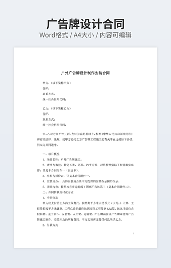 【特殊限制】设计师仅对作品中独创性部分享有著作权,对作品中含有的国旗、国徽等政治图案不享有权利,仅作为作品整体效果的示例展示,禁止商用。 相关关键词: 物业 广告 租赁 合同