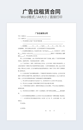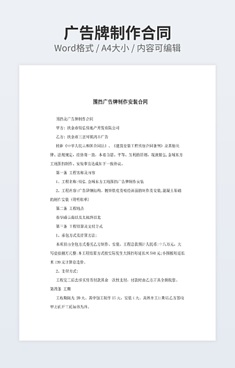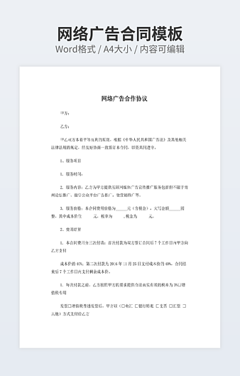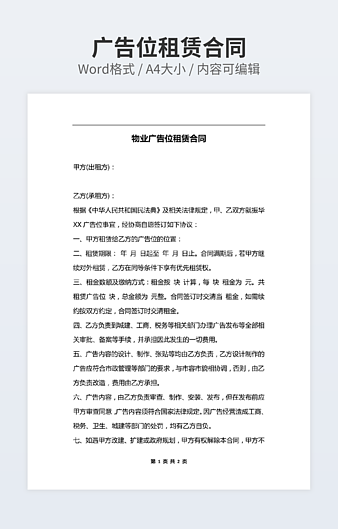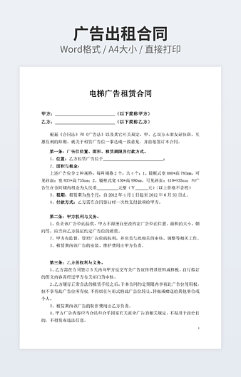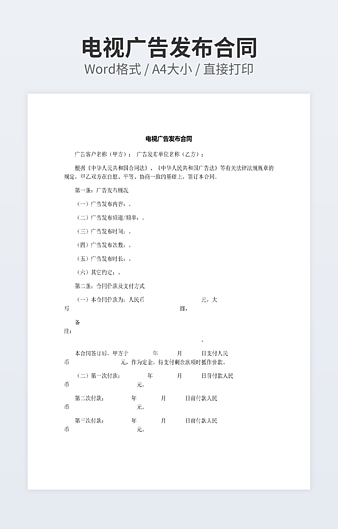 本作品内容为电梯液晶电视广告合同下载,大小为32.5KB,作品为高清大图模板,格式为doc, 属于广告合同模板,作品模板源文件下载后可用编辑替换,模板中如有人物画像仅供参考禁止商用。小Q办公网-提供简历,PPT,Word,Excel优质模板素材下载模版平台,拥有海量的工作总结、竞聘求职、年终颁奖、计划书等。 通过小Q办公网下载广告合同模板源文件编辑修改源文件文字和图片即可使用。