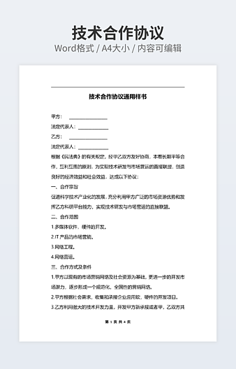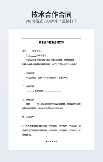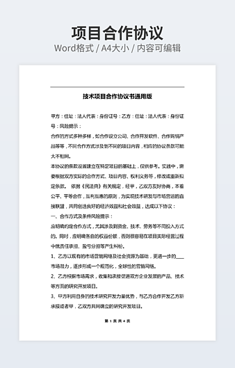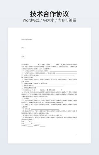 本作品内容为技术合作协议经典版下载,大小为15.5KB,作品为高清大图模板,格式为docx, 属于技术合作模板,作品模板源文件下载后可用编辑替换,模板中如有人物画像仅供参考禁止商用。小Q办公网-提供简历,PPT,Word,Excel优质模板素材下载模版平台,拥有海量的工作总结、竞聘求职、年终颁奖、计划书等。 通过小Q办公网下载技术合作模板源文件编辑修改源文件文字和图片即可使用。