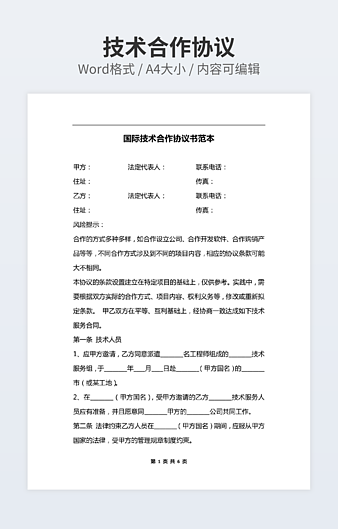 本作品内容为转让技术秘密和补偿贸易合作生产合同一下载,大小为18.22KB,作品为高清大图模板,格式为docx, 属于技术合作模板,作品模板源文件下载后可用编辑替换,模板中如有人物画像仅供参考禁止商用。小Q办公网-提供简历,PPT,Word,Excel优质模板素材下载模版平台,拥有海量的工作总结、竞聘求职、年终颁奖、计划书等。 通过小Q办公网下载技术合作模板源文件编辑修改源文件文字和图片即可使用。