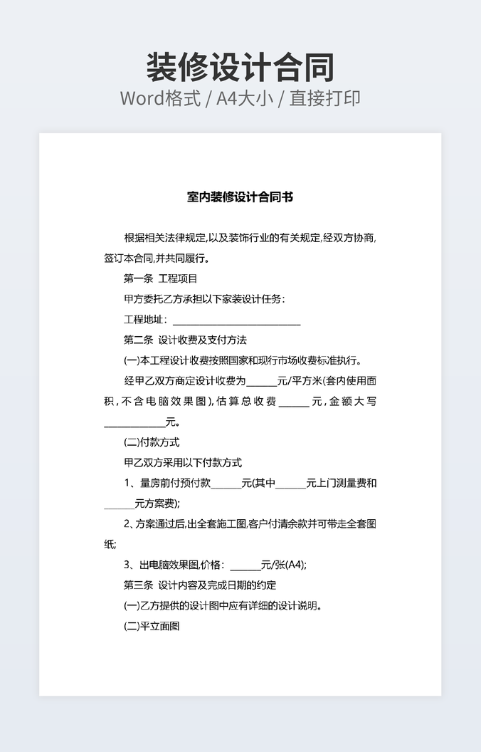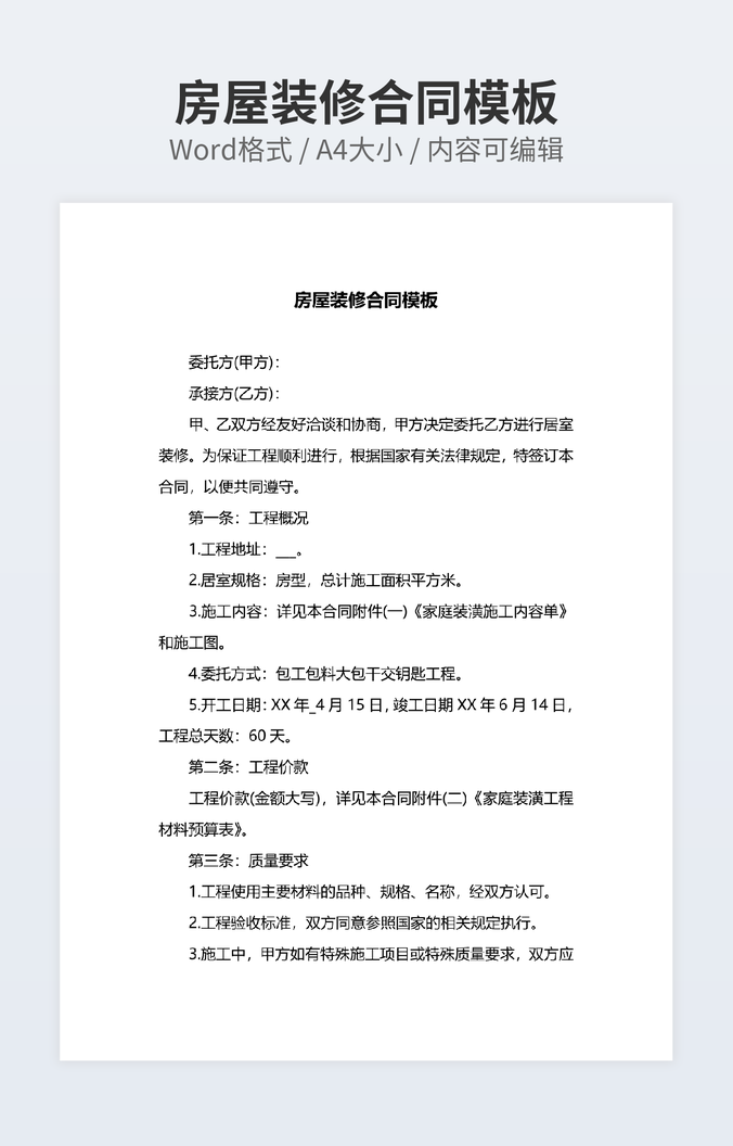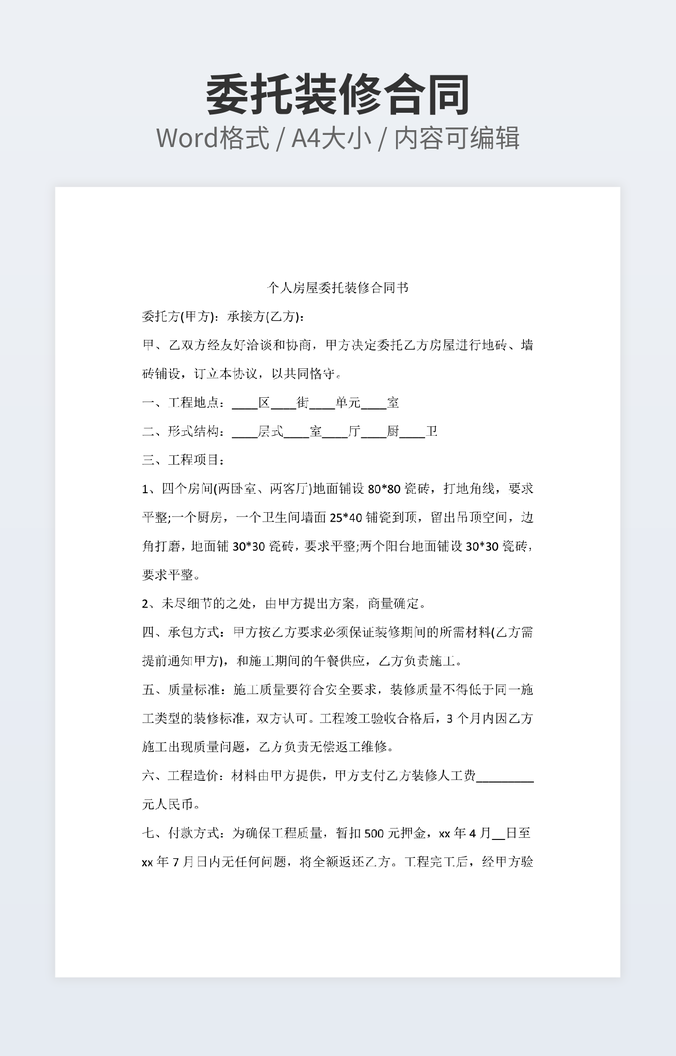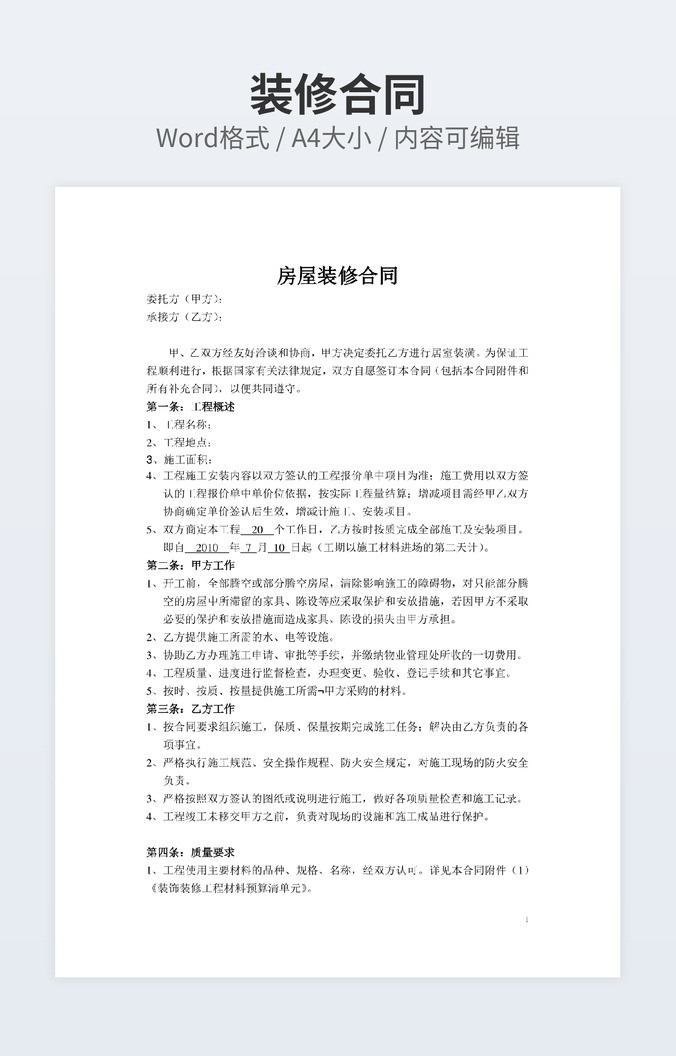 本作品内容为写字楼装修合同下载,大小为21.91KB,作品为高清大图模板,格式为docx, 属于房屋装修模板,作品模板源文件下载后可用编辑替换,模板中如有人物画像仅供参考禁止商用。小Q办公网-提供简历,PPT,Word,Excel优质模板素材下载模版平台,拥有海量的工作总结、竞聘求职、年终颁奖、计划书等。 通过小Q办公网下载房屋装修模板源文件编辑修改源文件文字和图片即可使用。