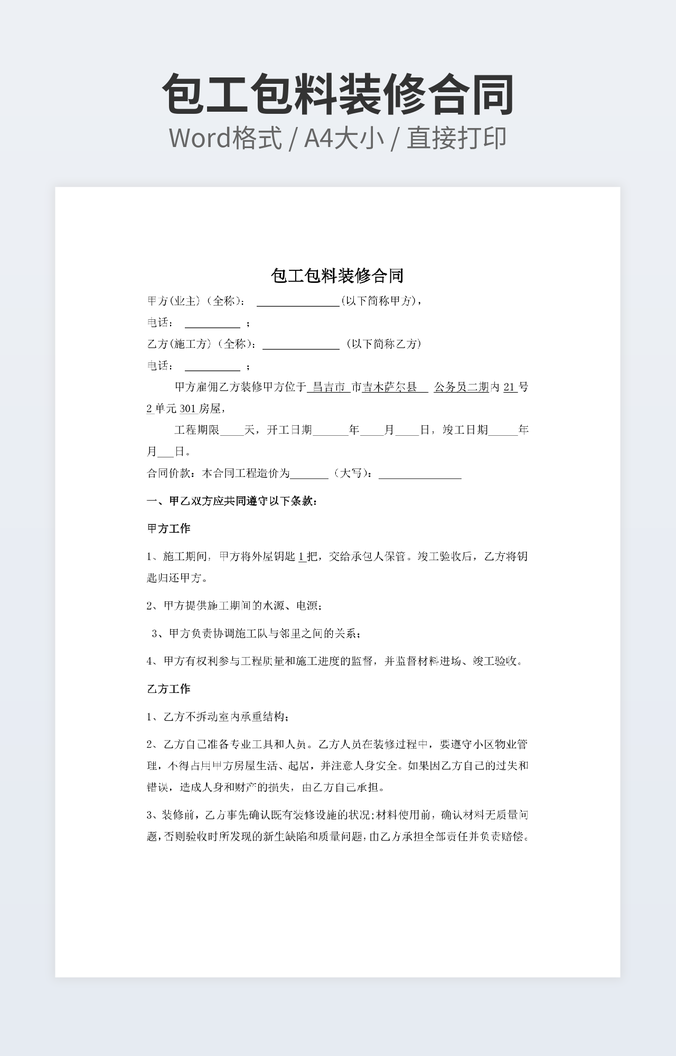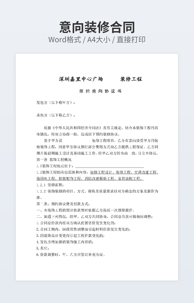 本作品内容为新房屋泥工类装修协议下载,大小为18.37KB,作品为高清大图模板,格式为docx, 属于房屋装修模板,作品模板源文件下载后可用编辑替换,模板中如有人物画像仅供参考禁止商用。小Q办公网-提供简历,PPT,Word,Excel优质模板素材下载模版平台,拥有海量的工作总结、竞聘求职、年终颁奖、计划书等。 通过小Q办公网下载房屋装修模板源文件编辑修改源文件文字和图片即可使用。